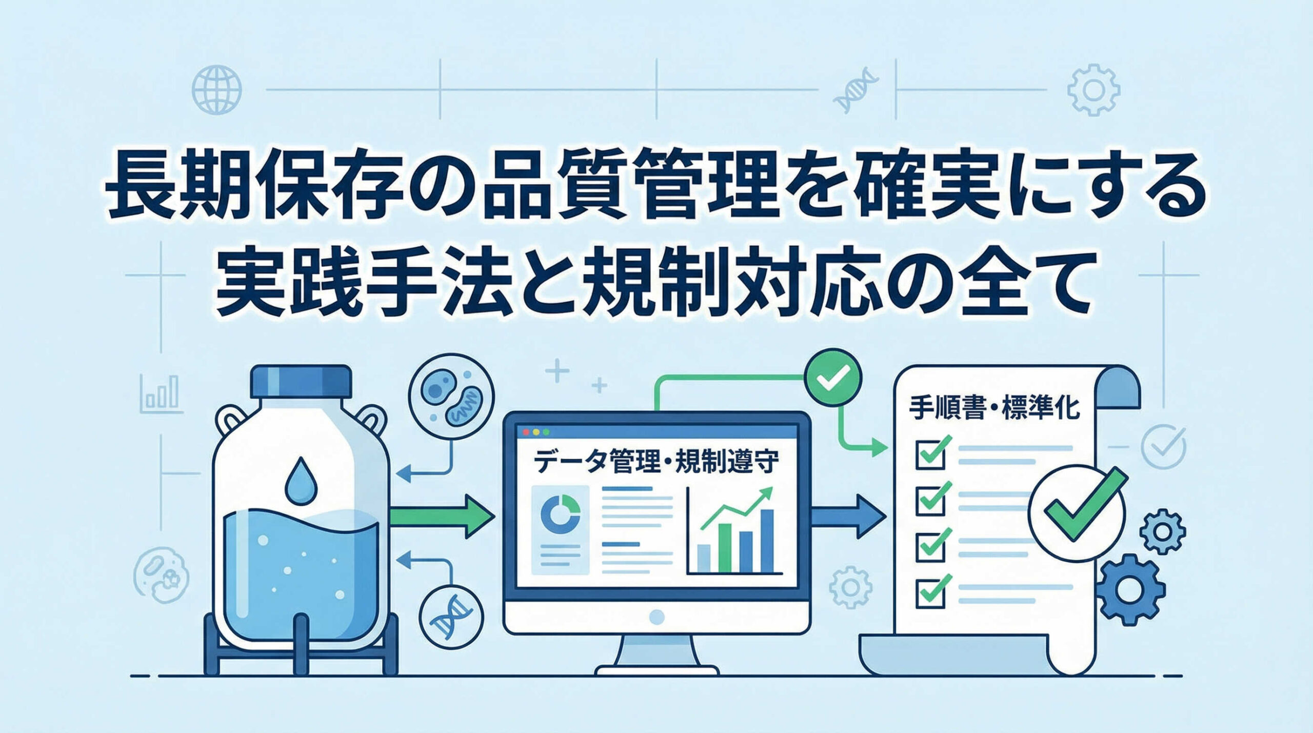再生医療等製品における長期保存は、単に時間を経過させることではなく、品質を能動的に維持し続ける高度な管理プロセスです。細胞の生存率や機能維持はもちろんのこと、将来的な規制対応や査察を見据えた場合、その管理体制には強固な科学的根拠と論理的整合性が不可欠となります。ここでは、品質管理の根幹となる考え方について整理していきましょう。